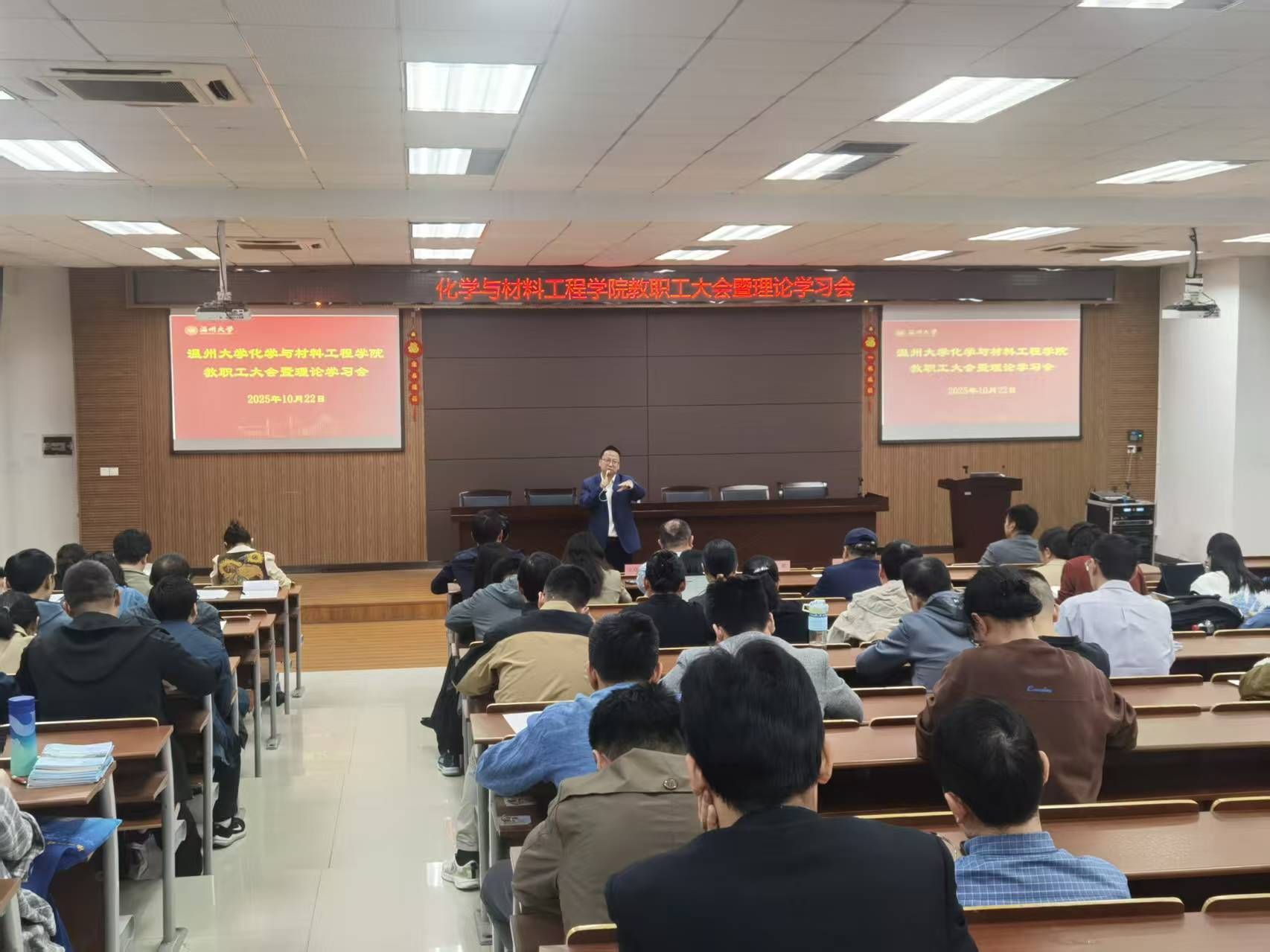 在11C401会议室召开教职工大会暨理论学习会。学院全体教职工参加会议。