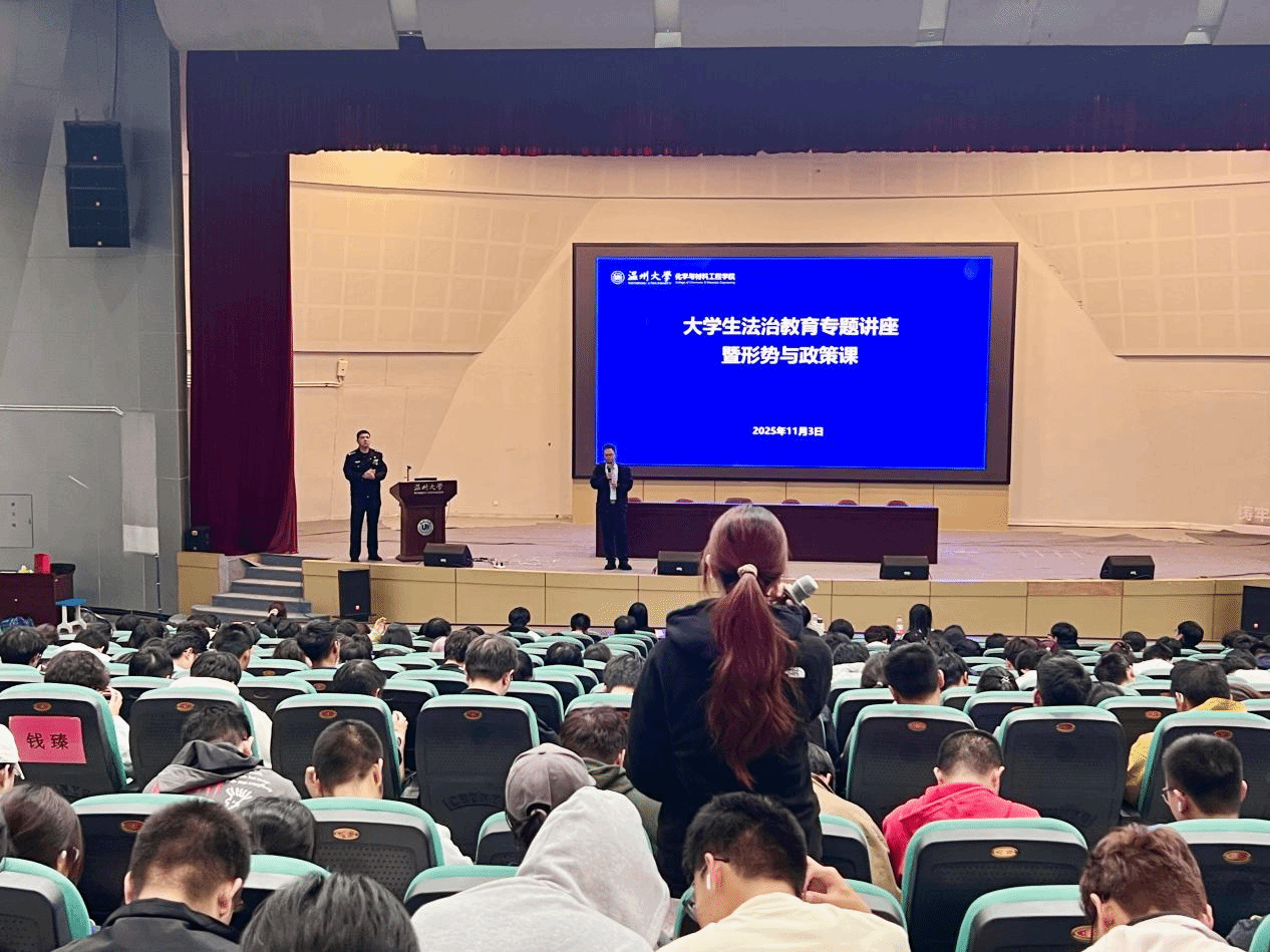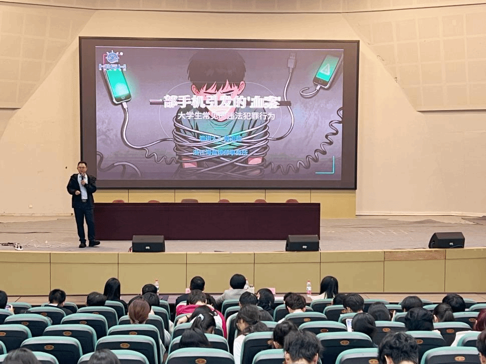 在南9号楼报告厅举办大学生法治教育专题讲座。茶山派出所潘鸿浩警长、陈志坚警官,浙江海昌律师事务所合伙人黄漫超律师,院党委副书记王晓华,学工办辅导员,2025 级全体本研新生及各年级班长、团支书、安全委员参会。讲座由“筑安”工程专项辅导员李政主持。