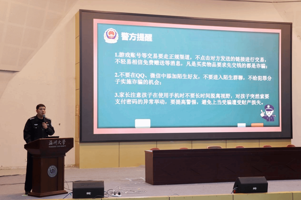 讲座核心环节由潘鸿浩警长、黄漫超律师联袂主讲。潘警长聚焦电信网络诈骗高发问题,结合一线办案经验,以鲜活案例深入剖析刷单返利、虚假购物、网络交友、冒充客服及公检法等大学生常见诈骗骗局,既揭示诈骗套路,更给出防范方法。“牢记‘不听、不信、不转账’,遇到诈骗疑问请拨打温大校园安全热线86696110或96110!”他反复强调的防范口诀,让安全准则深植学子心中。