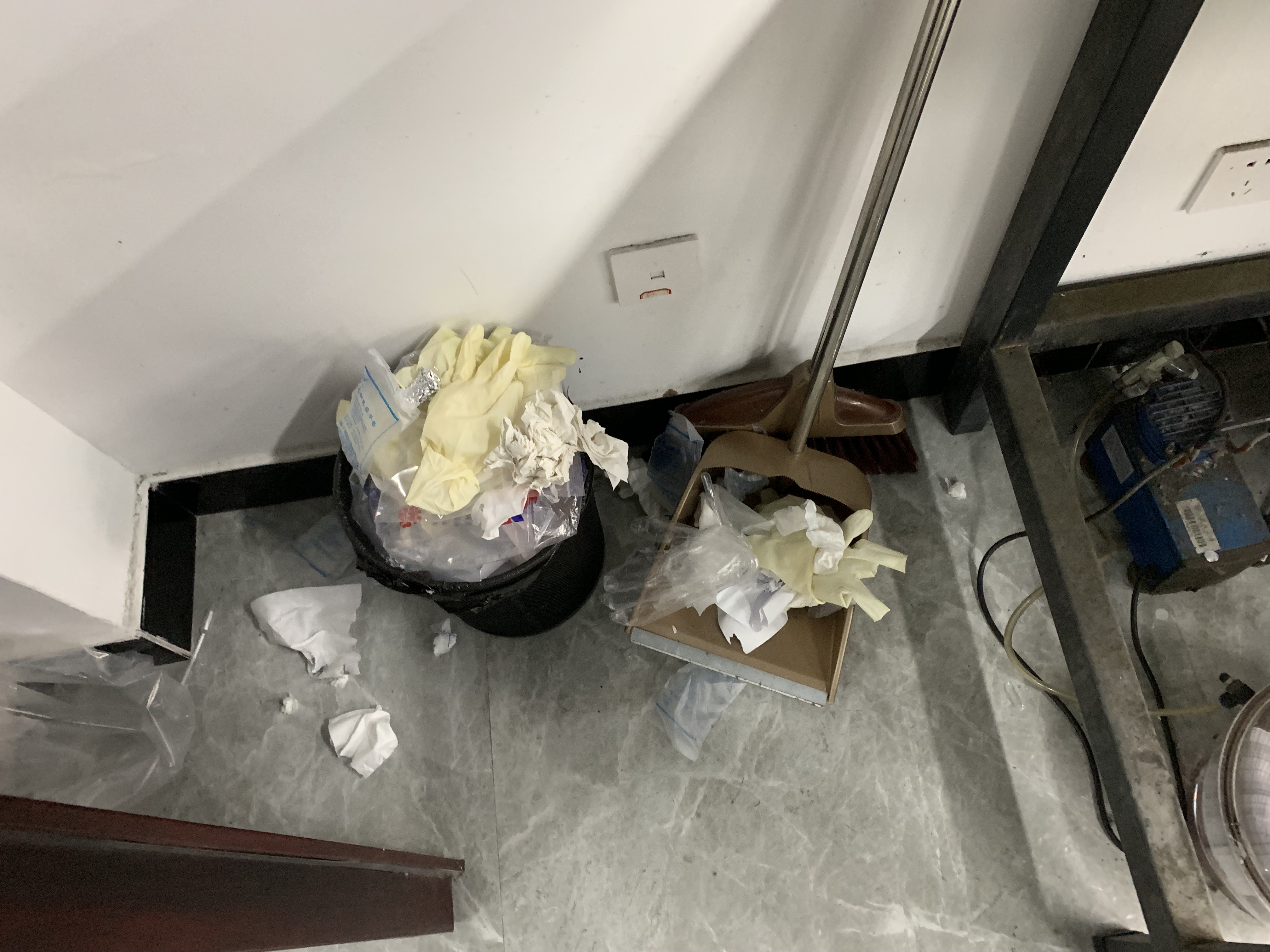 地面卫生差;堆积纸板箱;试剂瓶未贴标签 |