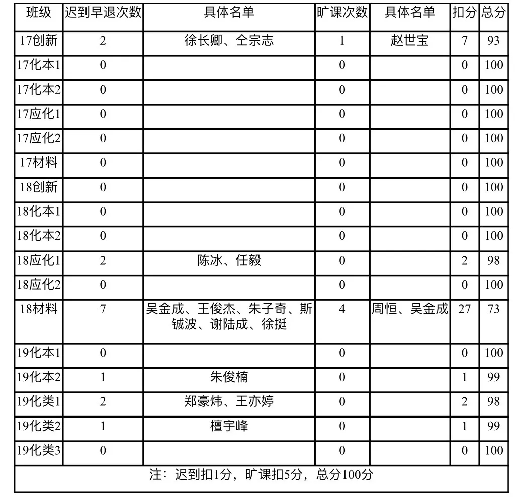 为保证疫情期间线上教学顺利展开、加强我院的学风建设、督促学生按时参与线上课程,现对2019-2020学年第二学期第十一周考勤情况进行通报。每天由各班负责人统计各科出勤情况并上报,最终一周的考勤情况于每周五进行汇总公布。