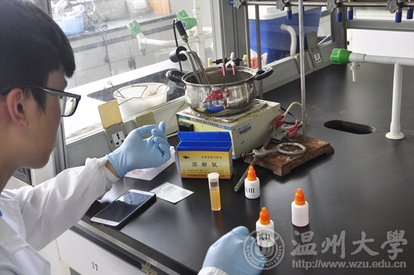化学材料与工程学院绿向导实践队正式开始他们的暑期实践之旅。上午队员们在温州市龙湾区区域内开展了水质检测活动,他们对永中河(永中河桥下)、八甲新街旁河道、轮船河滨水公园三片水域进行了河水取样并进行了相关的指标测试。下午同学们在实验室当中对相关的水样进行了进一步的检测分析。