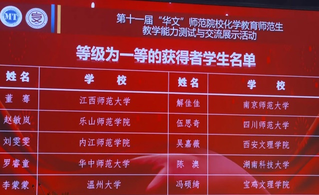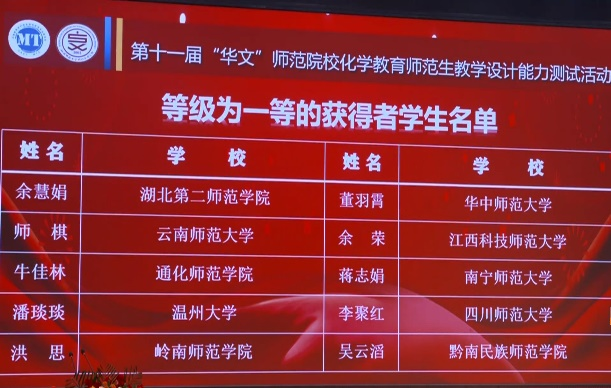 8月20日-22日,由中国教育技术协会微格教学专业委员会主办,山西师范大学现代文理学院承办的第十一届“华文”师范院校化学教育师范生教学能力测试与交流展示活动落下帷幕。我院高度重视本次比赛,积极备战全国比赛,我校八位参赛学生在陈迪妹、王秀杰、叶剑强、蔡晓庆和武晓岚等老师的精心指导与反复打磨下,最终获得了一等奖7项、二等奖9项的优异成绩。其中“教学设计能力测试”一等奖4项、二等奖4项;“教学能力测试与交流展示”一等奖3项、二等奖5项。