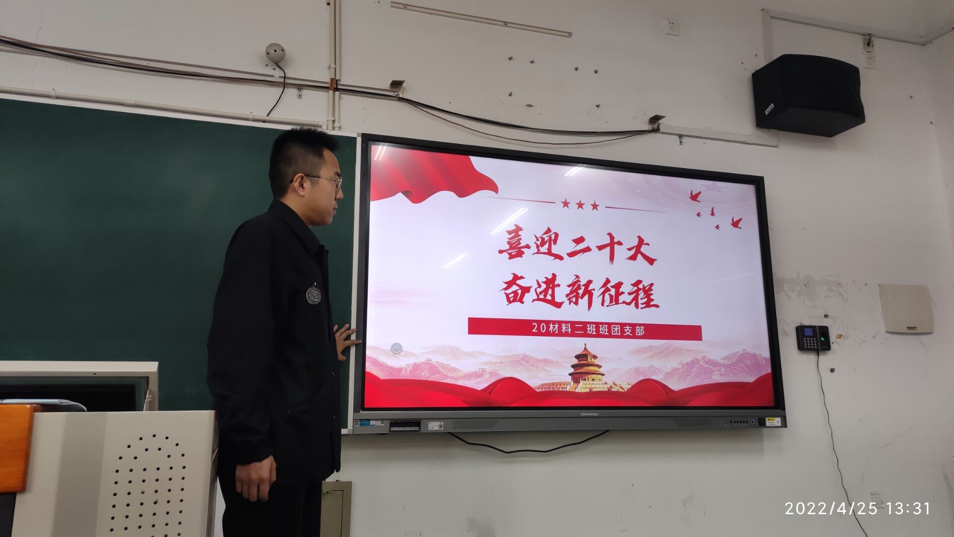 20材料2班在11A-103开展了以“喜迎二十大,奋进新征程”为主题的团课,本次团课的主讲人是刁呈璞和叶美玲同学。