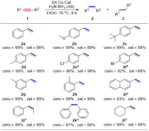最近,我院张剑课题组与清华大学王定胜课题组合作提出了一种新颖的复合氧化物策略来有效降低CN负载的Cu单原子催化剂的N原子配位数,从而使以氨硼烷作为氢源的炔烃选择性转移氢化反应得以在Cu单原子催化下顺利实现。