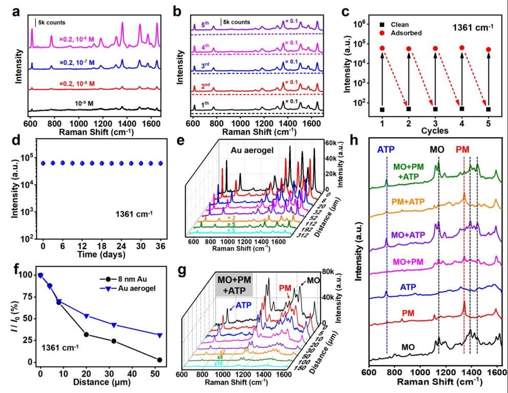 相对于典型的二维SERS基底(8 nm金膜),金气凝胶对染料分子、农药和致癌物质显示出更高的增强因子(高达达到8.9×109),这一结果超越了目前报道的绝大多数三维SERS基底(105-107)。此外,金气凝胶不近可重复使用,且具有非凡的稳定性(>1个月)和优异的多通道检测能力,预示其具有良好的实际应用价值。最后,金气凝胶具有优异的对焦容差(z轴方向> 300 μm),即便应用于多通道检测,其值也可达到150 μm,远超已报道的固态三维SERS基底。