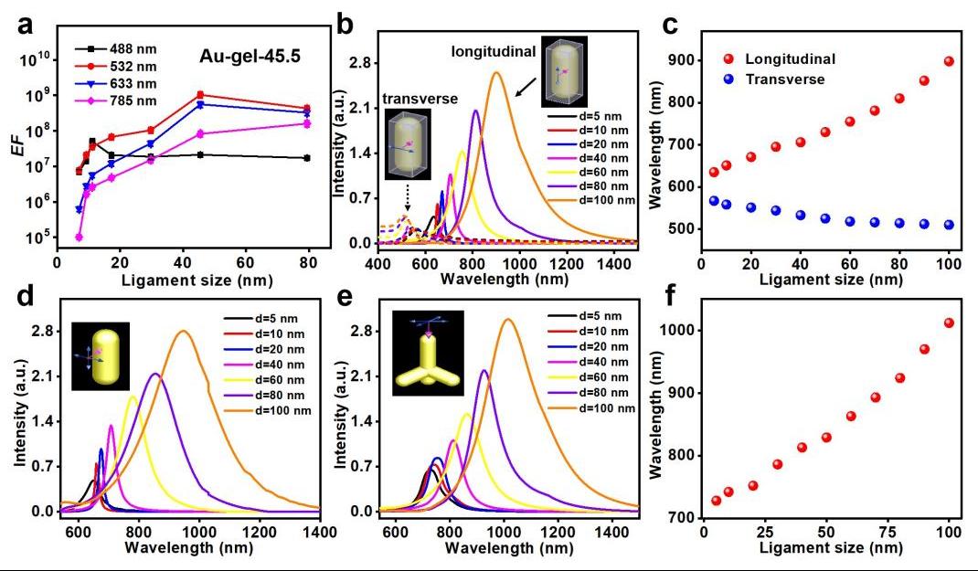研究者首先制备了特征尺寸(即纳米线直径)为5-100 nm的一系列金气凝胶。实验发现,SERS增强因子(EF)受金气凝胶的特征尺寸、激发波长影响。在同一激发波长下,增强效果均有一最优的特征尺寸,而伴随激发波长的红移,所对应的最优特征尺寸也随之增大,且对多种探针分子具有类似的规律。通过有限时域差分理论(FDTD)模拟的方法,以金纳米棒或四脚体作为模型,可清晰地观察到,伴随直径的增加,吸收波长逐步向长波方向移动,可推测金气凝胶的共振激发波长与特征尺寸成正相关,从而一定程度上解释了SERS活性与激发波长、特征尺寸依赖关系的作用机制。