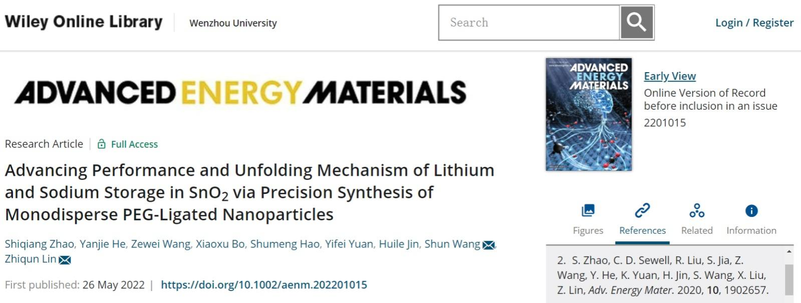 近日,国际能源顶级刊物《Advanced Energy Materials》(影响因子:29.368)在线刊登了我校赵世强副教授第一作者的研究论文“Advancing Performance and Unfolding Mechanism of Lithium and Sodium Storage in SnO2 via Precision Synthesis of Monodisperse PEG-Ligated Nanoparticles”(聚乙二醇接枝单分散二氧化锡纳米颗粒的精准合成及储锂/钠性能提升和储能机理探究),我校王舜副校长与佐治亚理工学院(美国)林志群教授为通讯作者,该研究工作受到国家自然科学基金项目(21905208)的资助。