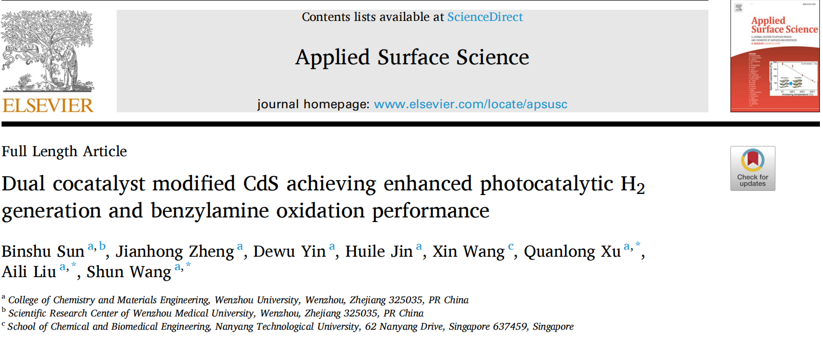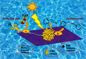 近日,我校徐全龙副教授在国际著名化学期刊《Applied Surface Science》发表了题为”Dual cocatalyst modified CdS achieving enhanced photocatalytic H2 generation and benzylamine oxidation performance”的论文。通过微波辅助合成的方法合理制备出三元PdS/CdS/MoS2光催化剂。在光催化反应过程中,CdS的光生电子会转移到作为还原助催化剂的MoS2表面参与还原反应,而其空穴会迁移到作为氧化助催化剂的PdS表面参与氧化反应,从而实现了电子和空穴对在空间上的分离。此外,水还原产生氢气的反应和苄胺氧化产生硝基苯的反应分别发生在不同的助催化剂表面,这有助于充分利用光生电子和空穴对,且具有低的反应活化势垒,从而表现出优异的光催化水分解产生氢气和苄胺氧化性能。
