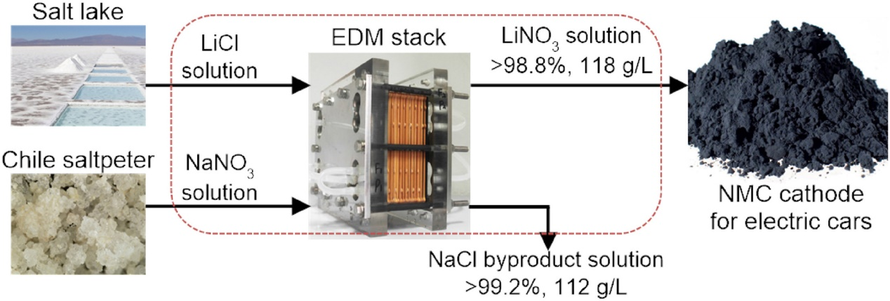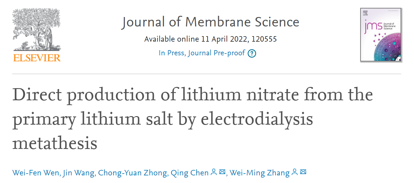 近日,我校张伟明教授课题组在国际著名化学期刊《Journal of Membrane Science》发表了“Direct production of lithium nitrate from the primary lithium salt by electrodialysis metathesis”的论文。该工作实现锂资源的转化,直接从含有锂离子和相应阴离子的两种进料盐中生产锂盐产品,获得高价值LiNO3产物。