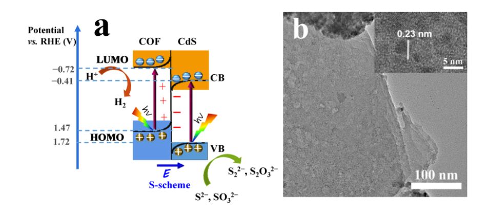 经过系统性的表征分析,发现CdS和COF界面处存在从COF指向CdS的内建电场。在该内建电场的作用下,来自CdS导带的光生电子与COF价带上的空穴复合,而COF导带上具有强还原能力的光生电子和CdS价带上具有强氧化能力的光生空穴得以保留,遵循S型异质结的电荷转移路径,从而保留最强的氧化还原能力,这为水还原产生氢气的过程提供强大的驱动力。本工作为设计制备有机/无机S型异质结光催化剂提供了理论基础。