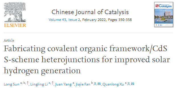 近期,我校徐全龙副教授在国际著名期刊《Chinese Journal of Catalysis》上发表了题为”Fabricating Covalent organic framework/CdS S-scheme heterojunctions for improved solar hydrogen generation”的研究论文。该工作利用对环境友好、可见光吸收强、能带结构合适、比表面积较大的COF-LZU1与具有空心立方结构的CdS复合,制备出COF/CdS异质结光催化剂,在可见光下表现出良好的光催化析氢性能。当异质结中COF质量含量达到1.5%时,具有最高的产氢速率,为8670 μmol·h−1·g−1,是纯CdS的2.1倍,且在420 nm单色光照射下的表观量子效率为8.9%。