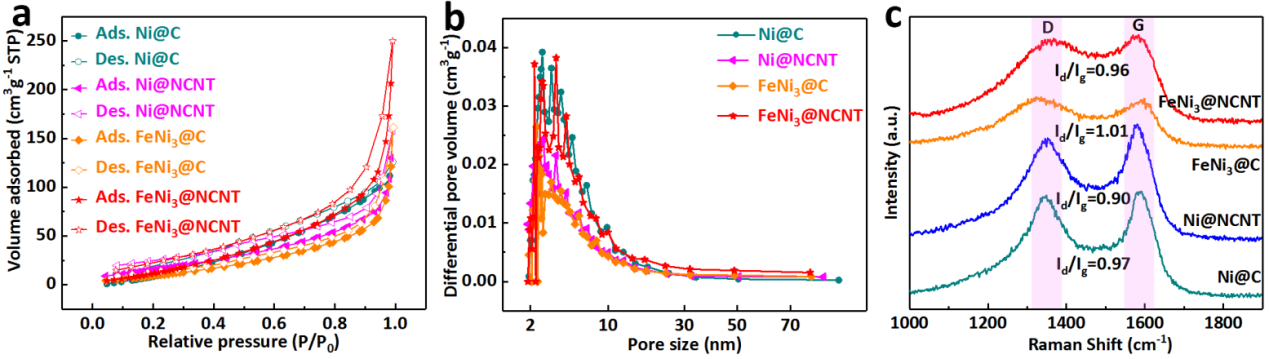 图6. Ni@C,Ni@NCNT,FeNi3@C和FeNi3@NCNT(a)氮气吸附等温线,(b)相应的孔径分布图,(c)Raman光谱。