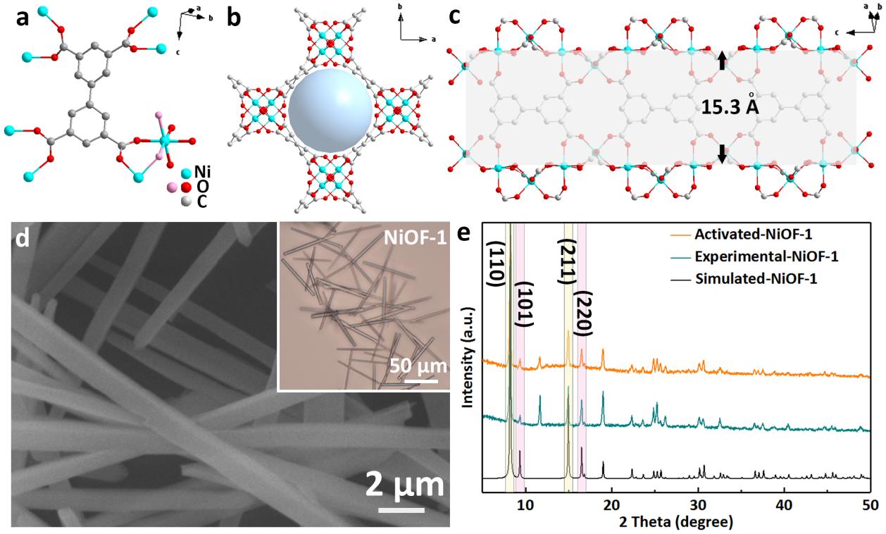 图2.(a)NiOF-1中BPTC4-连接体和Ni(II)中心的配位环境,NiOF-1的(b)三维四方通道,(c)沿c轴的圆柱形通道,(d)SEM/光学图像,(e)PXRD谱图。
