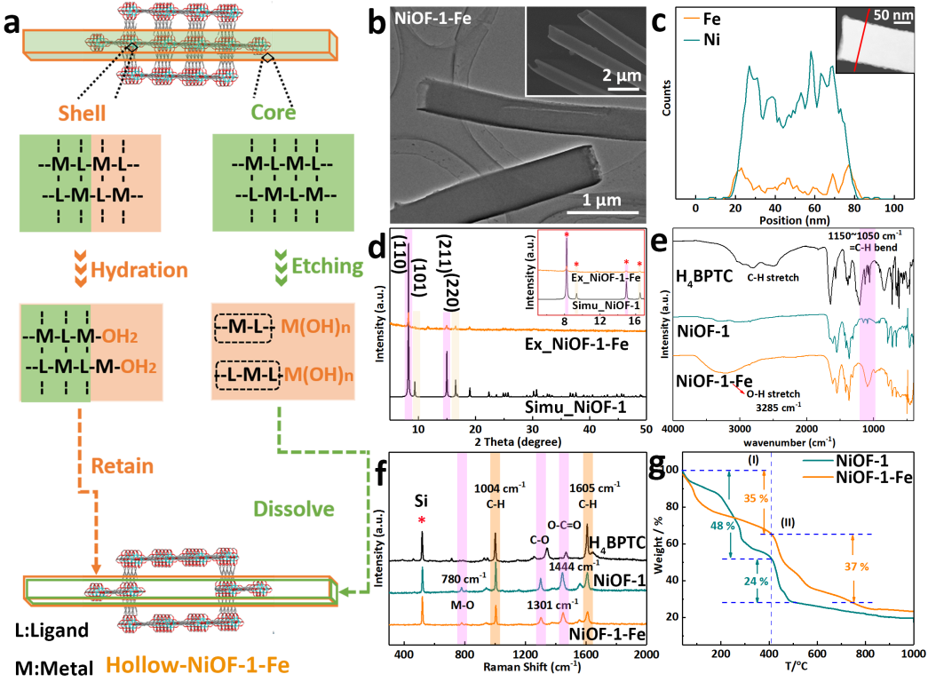 图3.空心NiOF-1-Fe的(a)蚀刻机理图,(b)TEM/SEM图像,(c)元素线扫图,(d)PXRD谱图,(e-f)FT-IR/Raman光谱,(g)NiOF-1和NiOF-1-Fe的TGA曲线。