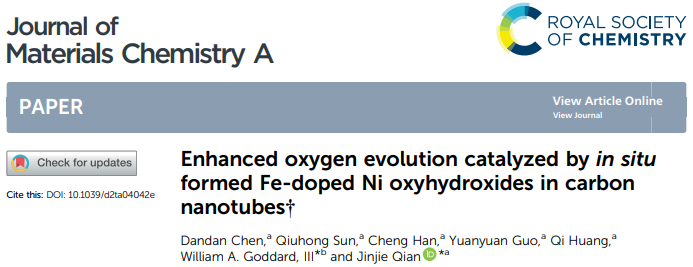 Dandan Chen, et al. Enhanced Oxygen Evolution Catalyzed by In-Situ Formed Fe-Doped Ni Oxyhydroxides in Carbon Nanotubes. J. Mater. Chem. A, 2022.