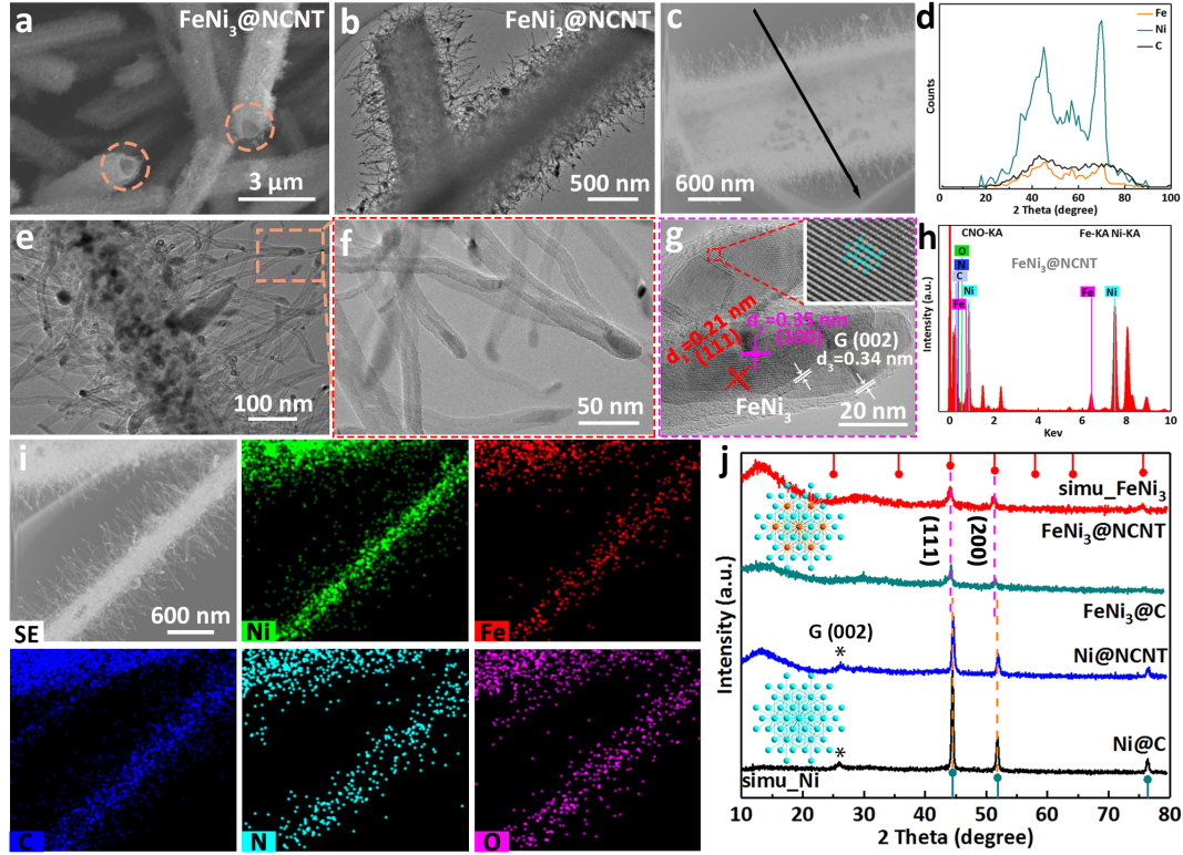 图4. FeNi3@NCNT的(a-b,e-g)SEM,TEM,HRTEM图像,(c-d)元素线扫图,(h)EDX谱图,(i)HAADF-STEM,和元素映射图,(j)PXRD谱图。