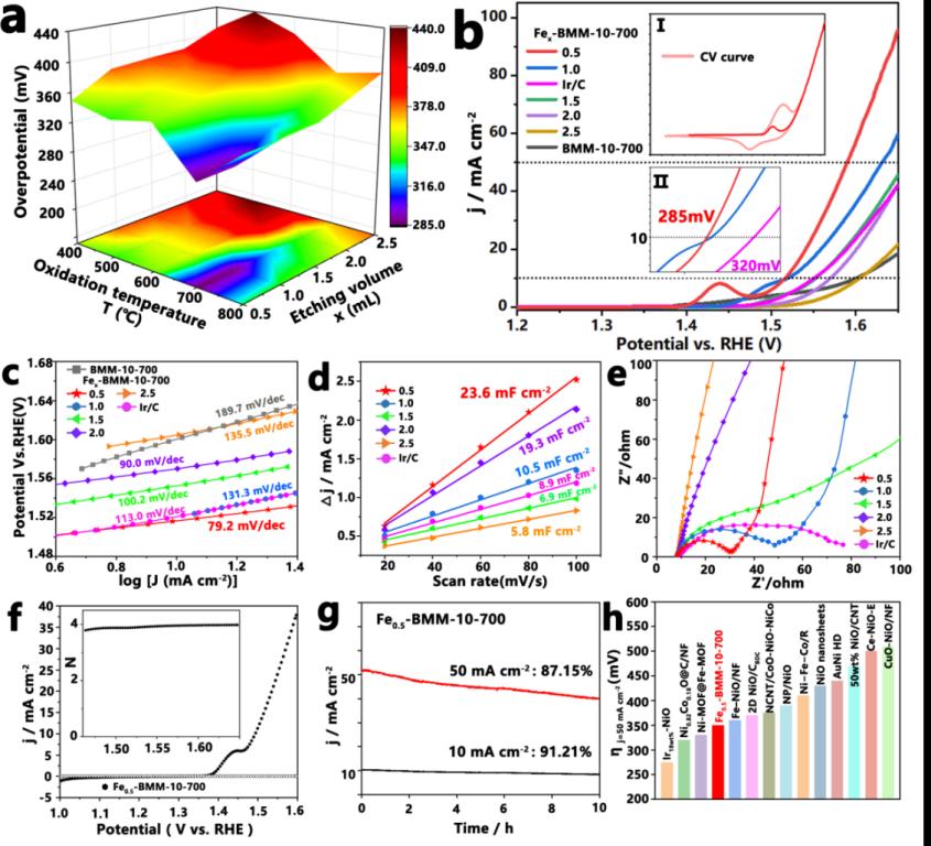 钱金杰副研究员等人成功合成了一系列由MOF衍生的FeNi氧化物纳米材料,其在碱性介质中展现出高效的OER性能。首先,以溶剂热法制备的微型桶状MOF(BMM-10)作为前驱体,控制所添加的Fe(III)的浓度,利用其刻蚀效应精确调控MOF衍生物形貌,获得不同刻蚀程度的Fex-BMM-10(x = 0.5, 1.0, 1.5, 2.0, 2.5)样品。随后将其在空气中直接进行高温氧化,成功制备了一系列形貌维持良好的中空Fex-BMM-10-T催化剂。最后,采用不同测试方法检测Fex-BMM-10-T材料OER性能,发现原位生成的不同电化学活性表面积的Fe掺杂NiOOH活性物质是其性能差异的主要原因。该策略的实施可以扩展到其它MOF衍生物的可控制备,从而高效用于能量转换和存储应用。