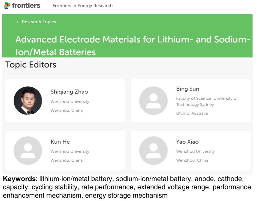 近日,我院赵世强、何坤和肖遥博士和悉尼科技大学孙兵博士受邀担任国际能源期刊《Frontiers in Energy Research》(《能源研究前沿》)电池专刊“Advanced Electrode Materials for Lithium- and Sodium-Ion/Metal Batteries”(锂/钠离子及金属电池先进电极材料)的Guest Editor(客座主编)。