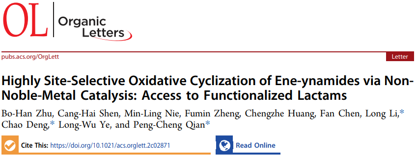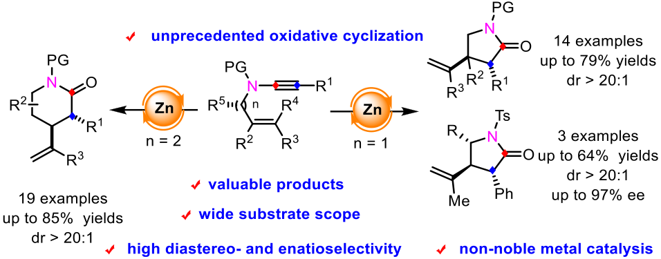 近日,我院钱鹏程-李龙教授课题组实现了烯烃取代内酰胺的高效、多样性合成。该方法研究了在锌催化剂作用下,烯炔酰胺化合物的分子间氧化环化反应。这种廉价金属催化的氧化环化反应具有高产率和优异的区域选择性、立体选择性等优点。