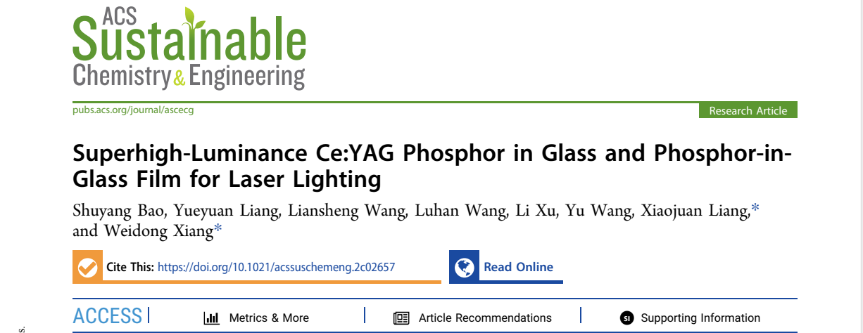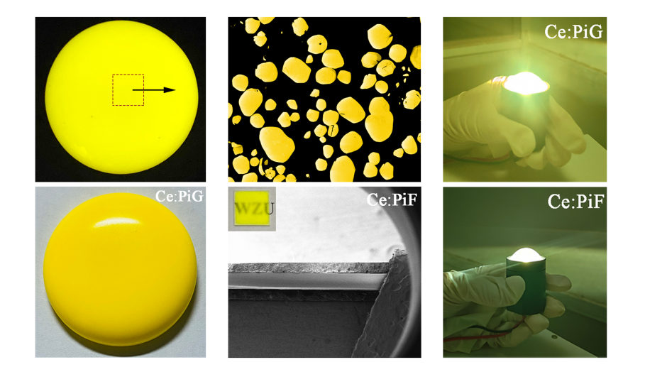 近日,我院向卫东教授课题组采用简便、通用的共烧方法在较低温度下制备了YAG: Ce PiG。确定了最佳烧结温度(900 ℃)和最佳玻璃粉粒径(50 μm)。优化后的样品具有较高的量子效率。为了获得白光并获得高的激光饱和阈值,将优化后的YAG: Ce PiG通过简单的方法涂敷在蓝宝石衬底上获得YAG: Ce PiGF。结果表明,荧光粉与玻璃基体的腐蚀反应轻微。因此,YAG: Ce PiG和YAG: Ce PiGF具有优异的热发光性能。优化后的YAG: Ce PiG的LE为240 lm/W (2.18 W/mm2),YAG: Ce PiGF的LE为251.5 lm/W (激光功率密度为8 W/mm2时)。这些结果为高功率和高亮度LD照明提供了巨大潜力。本文的研究成果为新一代高功率、高亮度激光照明技术的发展提供了系统的研究思路。