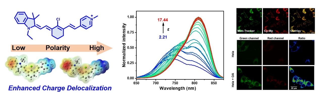 近日,我院陈忠研博士在国际期刊《Analytical Chemistry》发表了题为“Rational Design of a Near-Infrared Ratiometric Probe with a Large Stokes Shift: Visualization of Polarity Abnormalities in Non-Alcoholic Fatty Liver Model Mice”的论文。该工作中,作者通过花菁对称性塌陷策略设计合成了一例近红外极性荧光探针Cy-Mp,实现了健康小鼠和NAFL小鼠的成像区分。理论计算结果表明,与传统花菁Cy7-Cl相比,Cy-Mp由局域激发向电荷转移激发转变,同时Cy-Mp分子的电荷排布受环境极性影响,可以灵敏响应环境极性的改变,实现对溶液极性的快速、灵敏比率检测,且测试结果不受粘度和生命体系中常见物质的干扰。