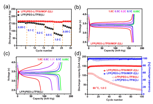 1. MOF-2填料的添加显示改善了PEO电解质的离子电导率(1.11×10-4- 5.20×10−4 S/cm,60℃);