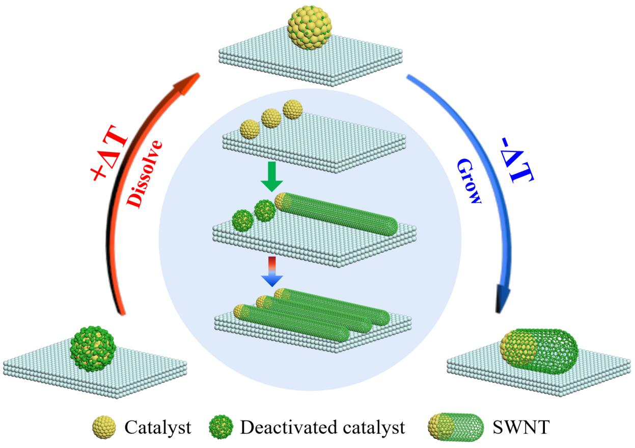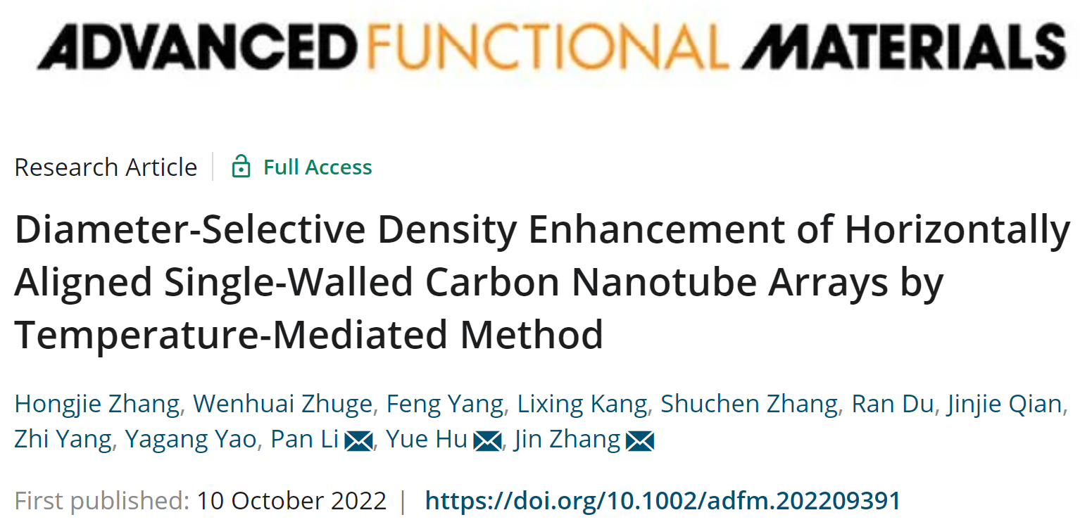 近日我院胡悦特聘教授团队联合南京邮电大学李盼副教授、北京大学张锦教授在控制制备高密度单壁碳纳米管(SWNT)方面取得新进展,开发了一种简单且新颖的温度扰动策略以制备具有管径选择性的高密度SWNT阵列,为SWNT在纳电子器件方面的提供了理想平台。相关成果以标题“Diameter-Selective Density Enhancement of Horizontally Aligned Single-Walled Carbon Nanotube Arrays by Temperature-Mediated Method”(DOI:10.1002/adfm.202209391)发表在Advanced Functional Materials。该工作通过调节温度对金属催化剂容碳量进行调控,再活化具有特定尺寸的因被碳包覆而失活的催化剂,使其继续催化生长特定管径的SWNT。最终使得在石英基底上获得的SWNT阵列的密度增加了三倍以上,且管径分布控制在2纳米左右。并通过环境透射电子显微镜对催化剂再活化过程进行原位研究,为催化剂效率的提高提供了关键性的见解。使用获得的SWNT阵列制作场效应晶体管器件,该器件表现出非常优秀的载流子迁移能力,表明所获得的SWNT阵列在纳电子器件中的应用潜力。女同av相关的文章发表在Advanced Functional Materials上,女同av
