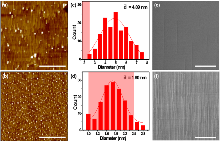 图3. 常规升温法(上)和快速成核法(下)制备的催化剂及SWNTs阵列的差异。(a,b)在基底上制备的催化剂AFM图。(c,d)催化剂纳米颗粒的直径分布(红色阴影区域代表合适SWNT生长的尺寸范围)。(e,f)生长出的SWNTs阵列的SEM图。(比例尺,a、b为1 μm, e、f为20 μm)。