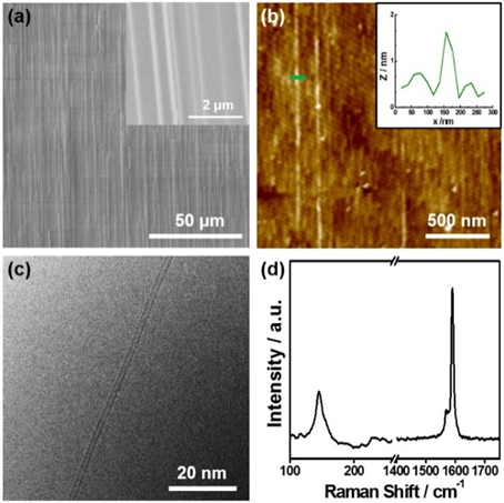 图2. 快速成核法在石英衬底上生长的水平SWNTs阵列的表征。生长出的SWNTs阵列的SEM图 (a)和AFM图(b)(插图:左,高倍SEM图;右图为单个SWNT的高度轮廓)。单根SWNT的TEM图像(c)和拉曼光谱(d)。