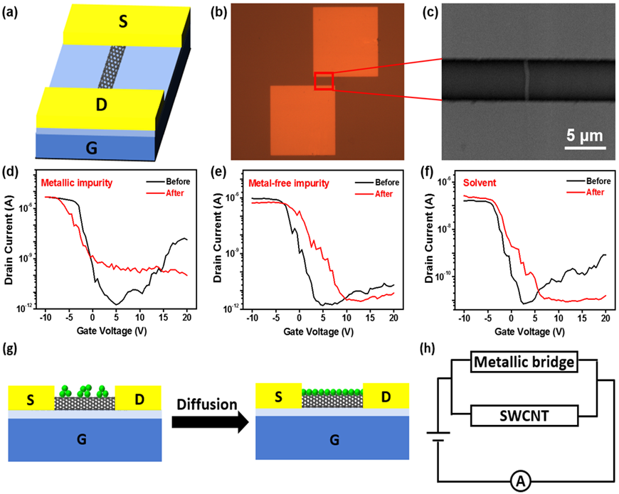 图5. 大量铁和氯化钠杂质对SWNT电子器件的潜在影响。(a-c) SWNT的底栅晶体管器件的构造图(a)、光学图(b)和SEM图(c)。(d-f)在Vds =1V时,初始半导体性SWNT与经过FeCl3溶液(d)、NaCl溶液(e)和乙醇(f)处理后的Ids−Vg曲线。(g) SWNT上金属颗粒连接电极形成金属桥的示意图。(h)金属桥形成后器件的电路图。