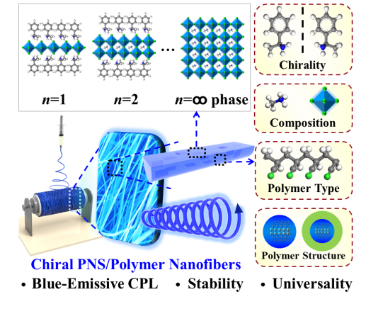 王舜/潘霜/陈亦皇课题组提出了一种通过一步静电纺丝法,原位合成聚合物纳米纤维保护的手性二维/准二维钙钛矿有机无机复合功能纳米材料,以实现室温下高效蓝色圆偏振发光。