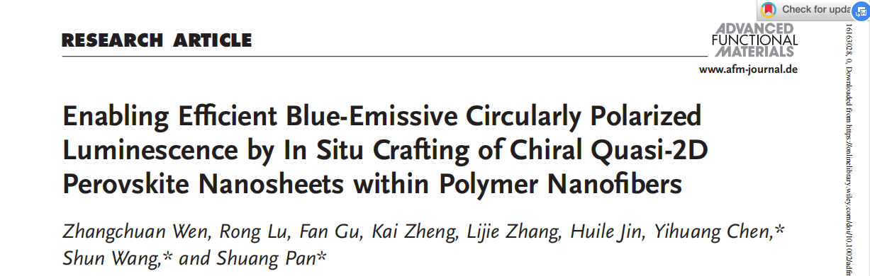 Wen, Z., Lu, R., Gu, F., Zheng, K., Zhang, L., Jin, H., Chen, Y., Wang, S., Pan, S., Enabling Efficient Blue-Emissive Circularly Polarized Luminescence by In Situ Crafting of Chiral Quasi-2D Perovskite Nanosheets within Polymer Nanofibers. Adv. Funct. Mater. 2022, 2212095.
