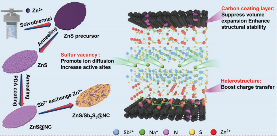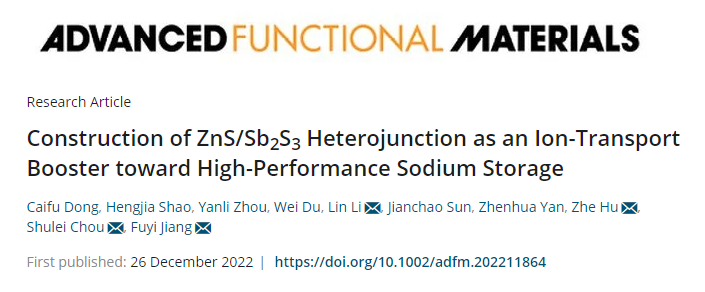 金属硫化物具有优异的氧化还原可逆性和较高的容量,在SIBs领域中具有广阔的应用前景。近日,我院碳中和技术创新研究院李林团队联合烟台大学和深圳大学在国际权威期刊Advanced Functional Materials上发表题为《Construction of ZnS/Sb2S3 Heterojunction as an Ion-Transport Booster toward High-Performance Sodium Storage》的学术论文。该工作通过阳离子交换法将Sb2S3引入ZnS中,合成了氮掺杂碳包覆的ZnS/Sb2S3 (ZnS/Sb2S3@NC)异质结结构。理论计算和实验研究表明ZnS/Sb2S3@NC异质结结构的构建有效的提升了电荷转移速率。因此,ZnS/Sb2S3@NC表现出优异的循环稳定性(循环450圈后可逆容量为511.4 mAh g-1)和倍率性能(在10 A g-1电流密度下的可逆容量为400.4 mAh g-1)。此外,通过X射线衍射和高分辨率透射电镜深入研究了ZnS/Sb2S3@NC的储钠机理。最后,组装了ZnS/Sb2S3@NC//Na3V2(PO4)3/ rGO全电池,其在循环50圈后仍具有226.2 mAh g−1的可逆容量。女同av相关的文章发表在Advanced Functional Materials上,我院侴术雷教授、李林特聘教授为该论文共同通讯作者,相关工作受到国家自然科学基金、浙江省自然科学基金、山东省自然科学基金和国家电网公司科技项目的资助。