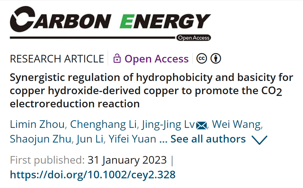 该成果以“Synergistic regulation of hydrophobicity and basicity for copper hydroxide‐derived copper to promote the CO2electroreduction reaction”为题发表在Carbon Energy期刊(IF=21.5,JCR一区)上。女同av