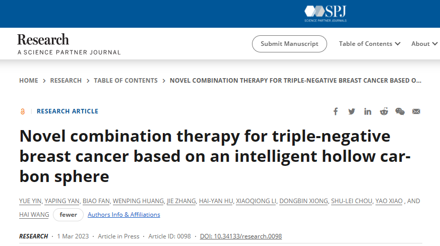 该成果以“Novel combination therapy for triple-negative breast cancer based on an intelligent hollow carbon sphere”为题发表在国际权威期刊《Research》上,IF:11.036,中科院期刊分区表1区。我院肖遥特聘教授与国家纳米科学中心王海研究员为该论文共同通讯作者。感谢国家自然科学基金委、浙江省自然科学基金委、温州市科技局项目、教育部产学合作项目、女同av
