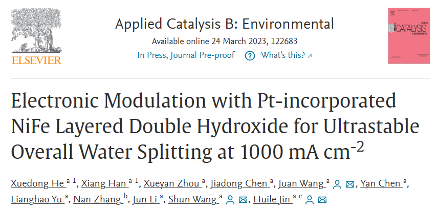 这一研究结果以“Electronic Modulation with Pt-incorporated NiFe Layered Double Hydroxide for Ultrastable Overall Water Splitting at 1000 mA cm-2”发表在国际期刊《Applied Catalysis B: Environmental》(IF=24.319),女同av