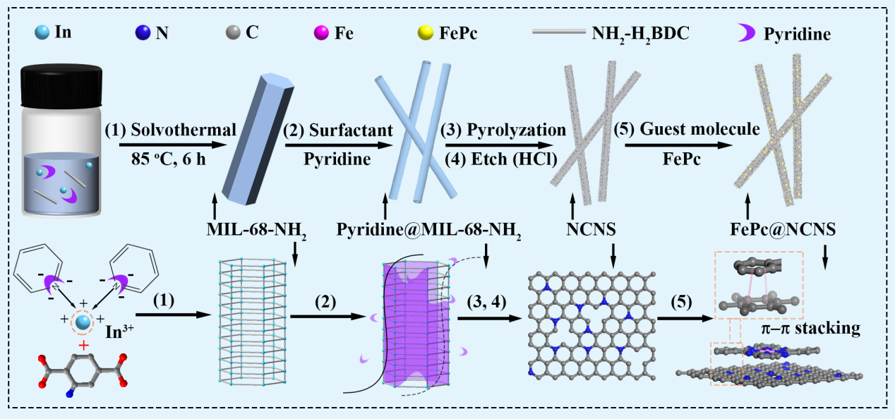 图1 MIL-68-NH2衍生FePc@NCNS多孔碳纳米材料的合成示意图