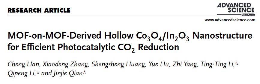 Cheng Han, Xiaodeng Zhang, Shengsheng Huang, Yue Hu, Zhi Yang, Ting-Ting Li, Qipeng Li, Jinjie Qian. MOF-on-MOF-Derived Hollow Co3O4/In2O3 Nanostructure for Efficient Photocatalytic CO2 Reduction. Adv. Sci., 2023.