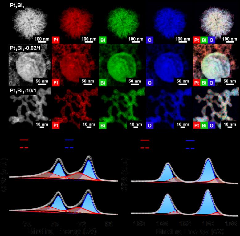 近期我院胡悦特聘教授团队联合北京理工大学杜然教授、普渡大学王进莹博士在MAs形貌调控方面取得新进展,同时对MAs的光电催化性能进行深入研究。相关成果以标题“Leveraging Ligand and Composition Effects: Morphology-Tailorable Pt-Bi Bimetallic Aerogels for Enhanced (Photo-)Electrocatalysis”(DOI:10.1002/smll.202301288)发表在Small上。在该工作中,通过协调配体和组成效应,成功制备了以0D纳米粒子、1D核壳纳米线、2D纳米片和3D微球为NBBs构筑的金属气凝胶,扩展了MAs的结构多样性。以甲醇氧化反应为模型反应,通过调整Pt-Bi气凝胶的形貌与光学特性,在300 mW·cm-2紫外线照射下,气凝胶的催化电流密度高达11.98 A·mgPt-1,比光照下的商业Pt/C高6.4倍,优于所有已报道的基于MAs的MOR电催化剂。本研究不仅为原位制备NBBs可调控的MAs提供了新的途径,而且为高性能MAs基电催化剂和光电催化剂的制备提供了新的角度。我院研究生硕士生薛耿为本文第一作者,女同av