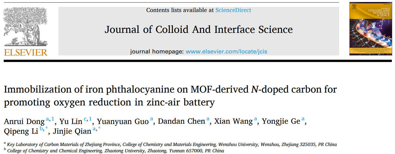 这项研究的成果题为《Immobilization of iron phthalocyanine on MOF-derived N-doped carbon for promoting oxygen reduction in zinc-air battery》,发表在《Journal of Colloid and Interface Science》(中科院1区,Top,IF=9.965)上。女同av