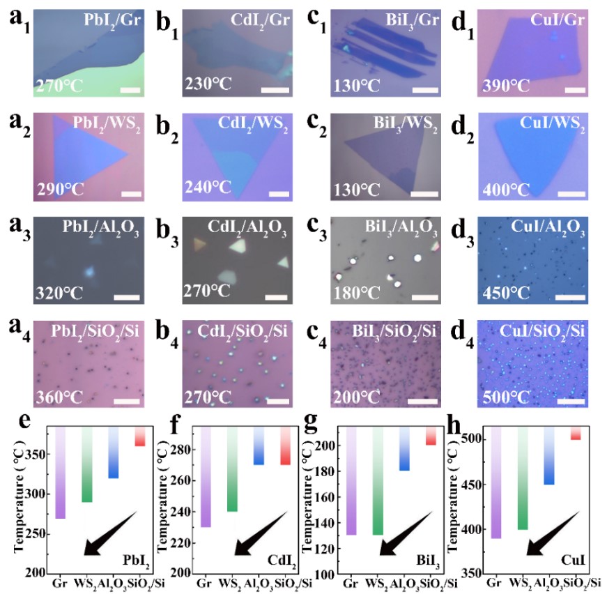 近日,我院张礼杰研究员等人针对在二维材料的低温可控生长难题,发展了一种普适性的范德华衬底辅助低温外延生长策略,大幅降低了二维碘化物原子晶体的生长温度,实现了系列二维金属碘化物( PbI2、CdI2、BiI3、CuI)在较低温度下的可控生长。系统研究了范德华、非范德华衬底对二维碘化物生长的影响,结合 DFT 计算结合 MD 模拟,发现与蓝宝石衬底相比,碘化物分子在二维范德华衬底(石墨烯、二硫化钼等)的吸附能和扩散势垒大幅降低,适当的吸附能与较低的扩散势垒,促使范德华衬底表面晶体的横向生长。揭示了扩散势垒对二维碘化物生长的影响规律,为低温生长高质量二维材料提供了策略和理论指导,该研究成果以“Van der Waals template-assisted low-temperature epitaxial growth of 2D atomic crystals”为题目发表在在材料领域国际权威学术期刊《Advanced Functional Materials》,女同av
