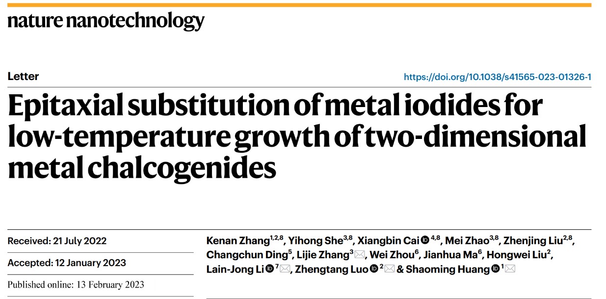 近日,我院张礼杰与广东工业大学黄少铭、香港大学李连忠、香港科技大学罗正汤等合作,针对二维材料及异质结与半导体芯片单片集成面临的温度限制难题,设计了一种普适性的范德华衬底协同二维碘化物低温原位替代生长方法,实现了 17 种高质量二维金属硫化物及其异质结的超低温可控生长(≤ 400℃)。结合理论计算,阐明了超低温原位替代生长机理,揭示了硫元素替换碘元素的低取代势垒微观本质,提出了碘化物硫(硒、碲)化的生长机理:替换反应优先发生在缺陷或边缘区域,之后的原子替代能垒大幅下降,发生了类似涟漪效应的连续 S-I 原子替换反应。并且在< 400℃下实现了多种二维材料及其异质结的大面积阵列集成,所制备的材料具有高的结晶质量和优异的光电性能。为二维材料与半导体芯片后端制造工艺的温度兼容性问题提供了一种可行性方案,并且为二维材料及其异质结的单片集成提供了一种新思路。该研究成果以“Epitaxial substitution of metal iodides for low-temperature growth of two-dimensional metal chalcogenides”为题目发表在在材料领域国际顶级学术期刊《Nature Nanotechnology》,女同av