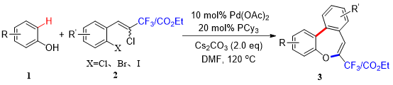 苯并氧杂䓬作为一种重要的含氧杂环化合物,在医药、农药和功能材料中具有非常重要的应用。含氟化合物因其有独特的性质而受到大量关注并得到广泛应用,因此发展高效的方法将三氟甲基基团引入到二苯并氧杂䓬骨架中具有重要的意义。