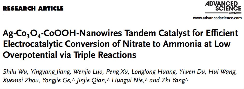 相关研究成果以《Ag-Co3O4-CoOOH-Nanowires Tandem Catalyst for Efficient Electrocatalytic Conversion of Nitrate to Ammonia at Low Overpotential via Triple Reactions》为题发表在国际著名期刊《Advanced Science》上,女同av
