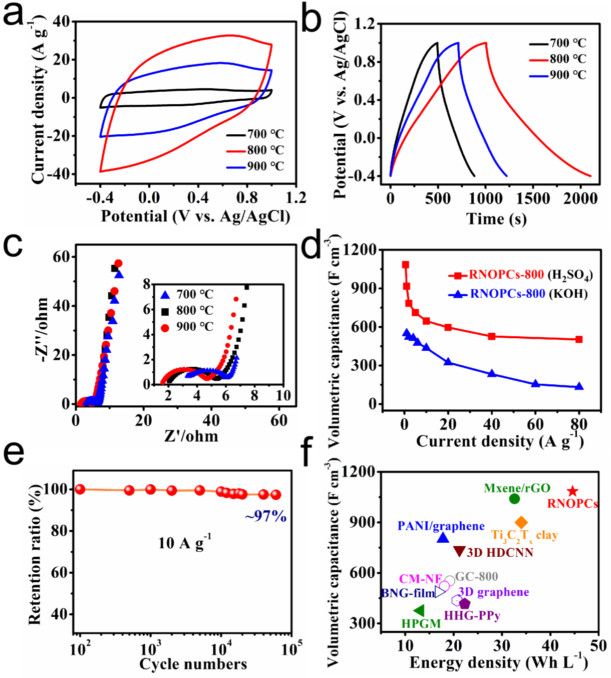 RNOPCs材料在0.5 H2SO4电解液中在稳定电压窗口可达1.4 V,其中RNOPCs-800电极在1 A g-1电流密度下的体积比电容高达1084 F cm-3,在10 A g-1下循环60000圈后的电容保持率高达97%。将RNOPCs-800电极组装成对称超级电容器,其能量密度高达54.3 Wh L-1。该工作中RNOPCs-800在酸性电解液中的体积比电容(1084 F cm-3)和能量密度(54.3 Wh L-1)高于目前所报道的所有碳基超级电容器。