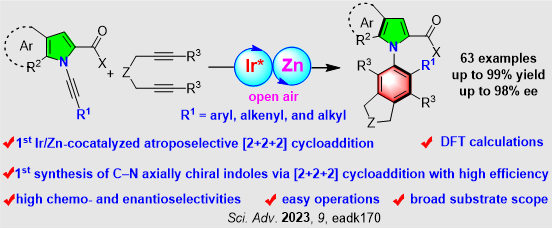 本论文以“Ir/Zn-cocatalyzed chemo- and atroposelective [2+2+2] cycloaddition for construction of C-N axially chiral indoles and pyrroles”为题发表在《Science Advances》上。女同av