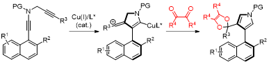 我院钱鹏程教授等人在知名的期刊《Chem. Commun.》上发表了题为” Copper-catalyzed atroposelective formal [4+1] annulation of 1,2-diketones with vinyl cations”的文章。本文报道了铜催化1,2-二酮不对称形式[4+1]环化反应合成了具有应用价值的轴手性化合物。作者基于发展成熟的铜催化二炔化合物生成的具有远程手性的烯基阳离子中间体,设计了具有位阻效应的萘基取代的二炔底物。二炔底物在手性铜催化下可以生成具有轴手性的烯基阳离子中间体,随后该中间体再由1,2-二酮捕获发生[4+1]环化反应顺利的合成具有高对映选择性的轴手性化合物。该反应具有良好的官能团兼容性以及广泛的底物普适性。此外,产物可进行简单的衍生化得到不同的具有轴手性化合物的产物。值得一提的是,该反应是首次报道不对称催化1,2-二酮的[4+1]环化反应。