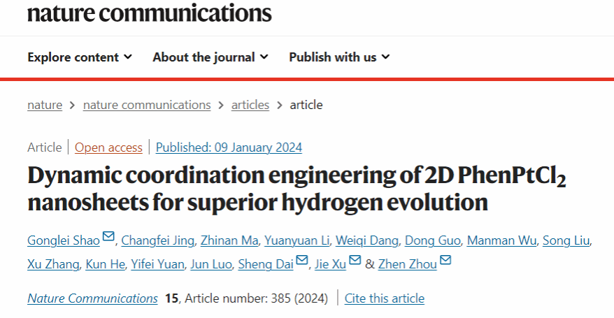 该研究以“Dynamic coordination engineering of 2D PhenPtCl2 nanosheets for superior hydrogen evolution”为题发表在Nature子刊《Nature Communications》,我院何坤、袁一斐、许杰为本文作者,周震教授、许杰特聘教授、戴升教授及邵功磊研究员为本文共同通讯作者,相关工作受到国家自然科学基金等资助。