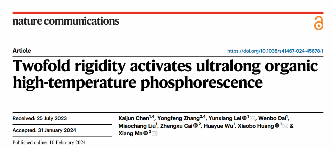 近日我院黄小波教授/雷云祥特聘教授联合华东理工大学马骧教授在国际顶级期刊《Nature communications》上发表题为《Twofold Rigidity Activates Ultralong Organic High-Temperature Phosphorescence 》的学术论文。该工作选择具有几乎完全平面结构的刚性分子9H-二苯并[a,c]咔唑(BCZ)作为客体分子,平面结构可以使分子的振动和旋转最小化。此外,刚性结构有利于增加磷光寿命,延长余辉时间。选择具有刚性结构和高玻璃化转变温度的聚乙烯吡咯烷酮(PVP)作为主体基质,进一步抑制客体的分子运动。这种双重刚性导致掺杂材料BCZ/PVP在293 K下表现出40 s的超长余辉,在373 K下表现出长达20 s的强余辉,在413 K下表现出约6 s的明亮余辉,甚至在433 K下表现出1 s的清晰余辉,表现出优异的HTP性能。此外,将旋转能力从弱到强的甲基、正丁基、苄基、苯基和三苯胺基进一步连接到BCZ分子上,制备了5个对照客体(BCZ-Me、BCZ-nBu、BCZ-Be、BCZ-Ph和BCZ-TPA)。烷基(如甲基或正丁基)对分子激发态能的影响相对较小,因此BCZ-Me/PVP和BCZ-nBu /PVP掺杂材料表现出与BCZ/PVP几乎相同的HTP性能。从BCZ-Be到BCZ-TPA,随着基团旋转能力的增加,相应掺杂材料的HTP性能逐渐下降,符合逻辑和预期的趋势。实验结果和理论计算表明,刚性平面结构可以抵抗高温下的分子热运动。此外,主体基质在高温下提供的刚性环境是影响材料HTP性能的重要因素。进一步选择聚乙烯醇(PVA)和聚己二酰己二胺(PA66)作为主体基质。虽然所有掺杂材料均表现出优异的RTP性能,但由于PVA和PA66的玻璃化转变温度值低于PVP,以PVA或PA66为主体的掺杂材料的HTP性能弱于以PVP为主体的掺杂材料。最后,以其他四种平面分子为客体的掺杂材料也表现出优异的HTP性能,表明双刚性策略具有良好的通用性。本研究提出了构建HTP材料的策略,将促进有机磷光材料的发展。